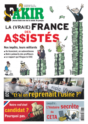 Le journal alternatif Fakir a aussi une pratique quelque peu alternative du dessin de presse, plus ou moins présent selon les numéros. Le numéro 78, de décembre-janvier, qui vient de paraître fait partie de ceux plutôt bien garni en la matière.